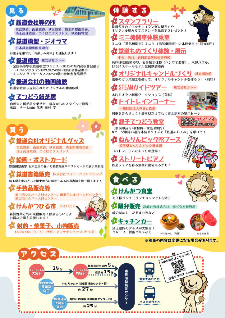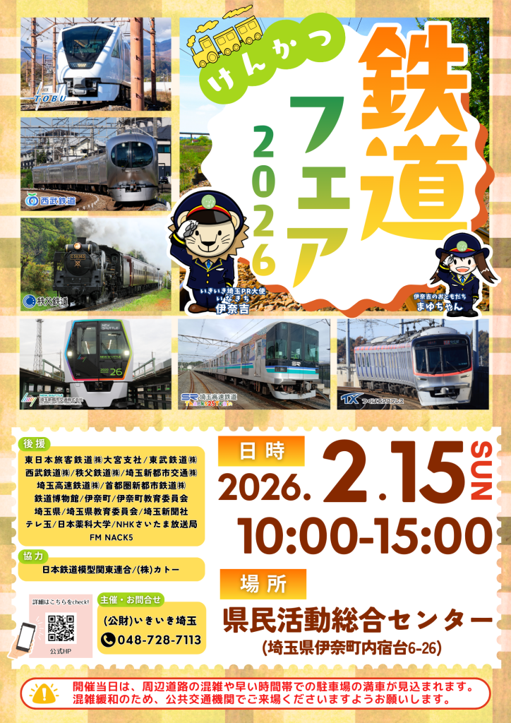 (公財)いきいき埼玉では、身近な乗り物である鉄道を通して、埼玉県内を運行する鉄道や埼玉県内の観光などを県民にアピールし、地元埼玉への理解を深めることを目的に、2026年2月15日(日)に埼玉県県民活動総合センターにて、「けんかつ鉄道フェア2026」を開催します。