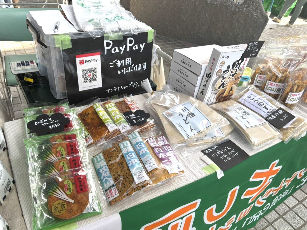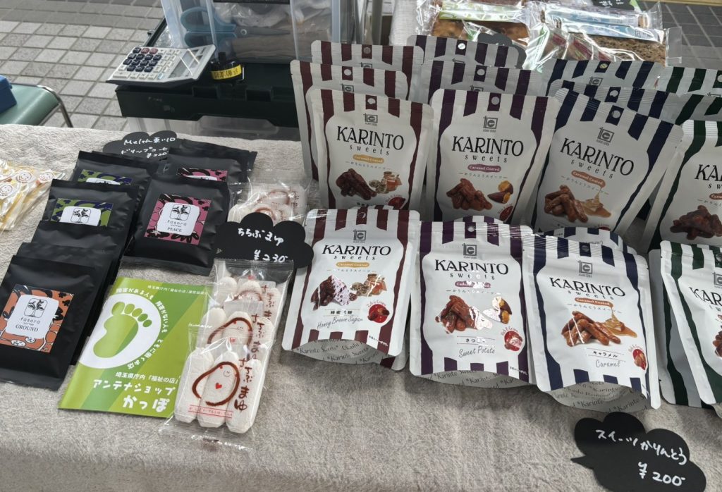 けんかつひる市では、お菓子、障害者施設の製品、埼玉県産品などを販売しています!